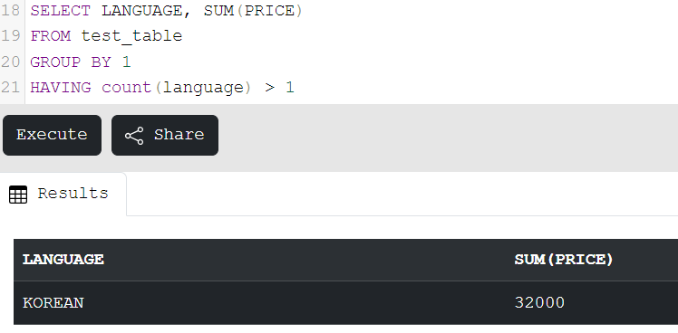 결론 : 집계함수에 조건을 주고 싶으면(= 그룹화된 칼럼에 조건을 주고 싶으면) GROUP BY 데이터에 조건을 주는 HAVING 사용하기
