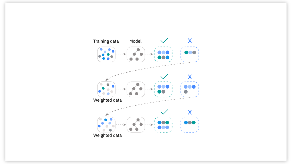 - 이전 모델의 틀린 부분에 가중치를 두면서 보완학습