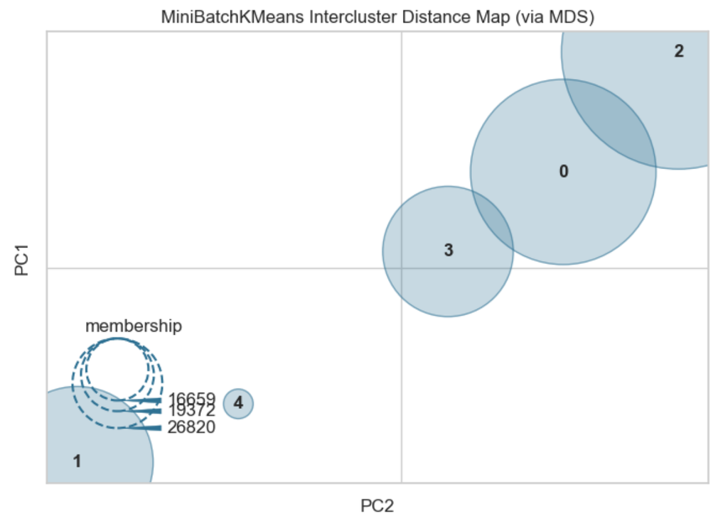 군집 간 거리를 시각화해줌 (어디까지나 확인용)from yellowbrick.cluster import intercluster_distance from sklearn.cluster import MiniBatchKMeans intercluster_distance(MiniBatchKMeans(5, random_state=42), pca_df)