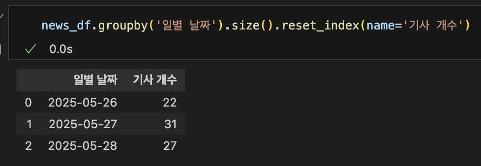 이후 일별 기사 개수 카운팅하는 것까지 분석해보았다.