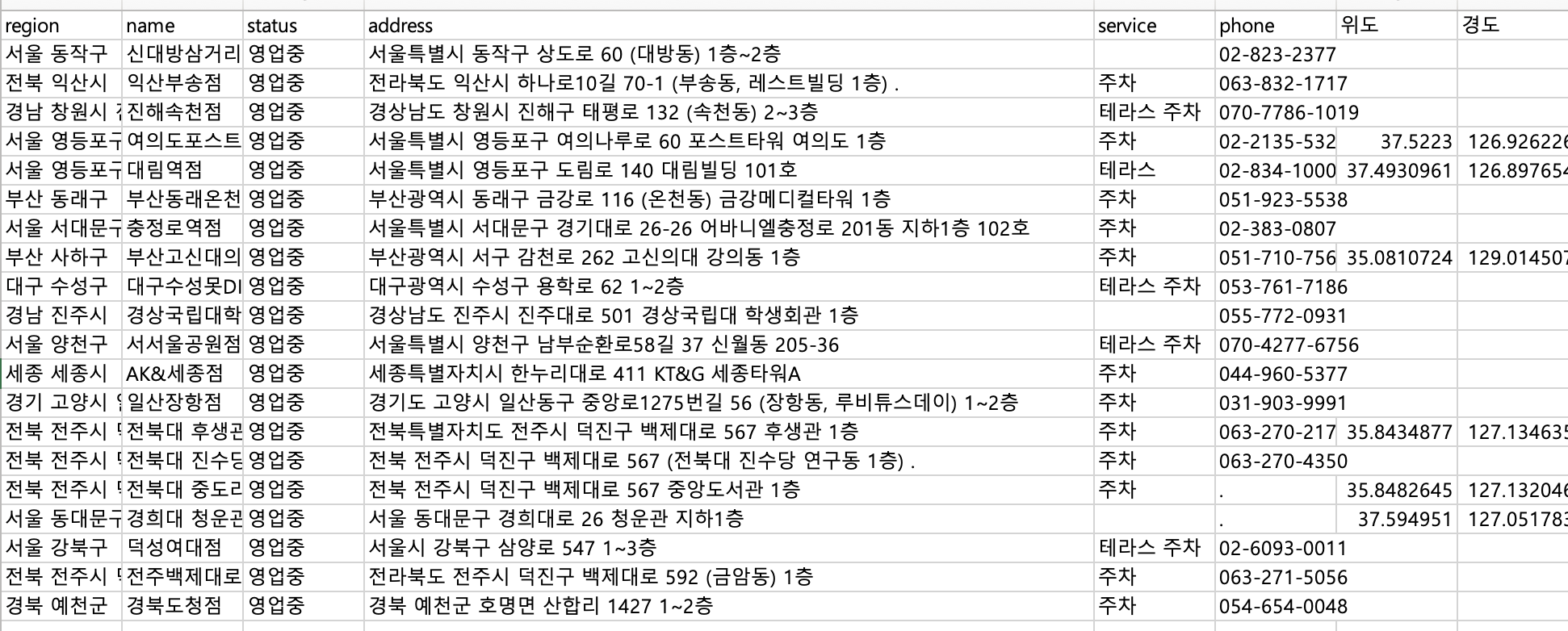 ↗ 카카오맵 - 할리스 카페 위치 정보 파악 및 folium 시각화 실습 (위도/경도)